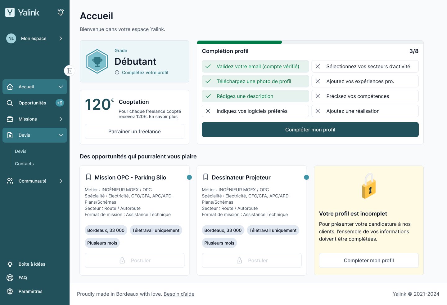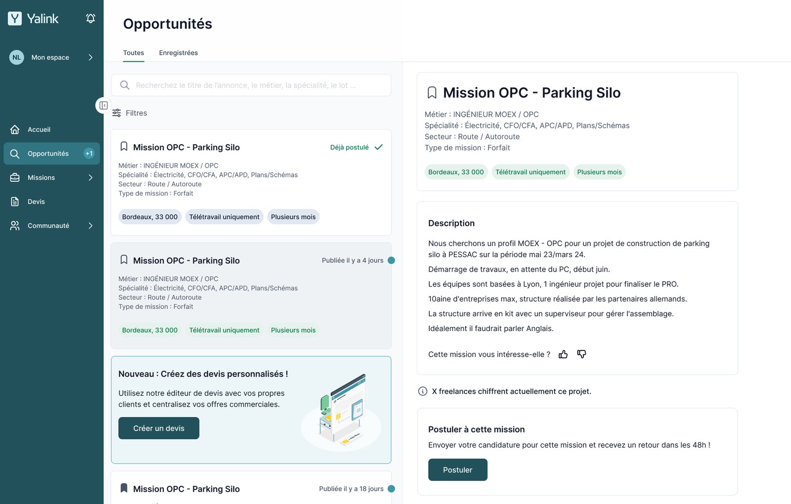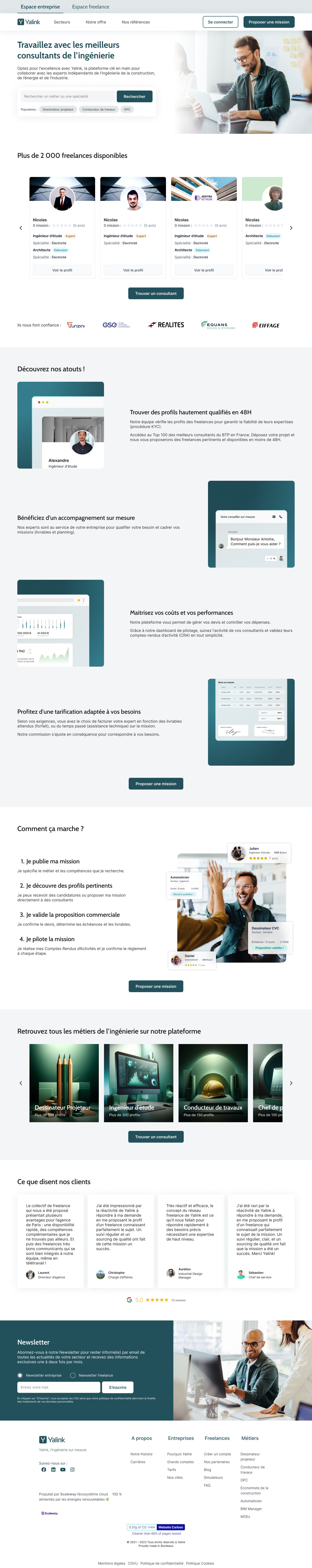 Yalink est le premier écosystème freelances dans l'ingénierie de la construction et de l'industrie. L'objectif a été de développer une web application permettant à des entreprises de publier des missions et à des freelances de proposer leurs services. Le site vitrine a également été repensée pour être plus ergonomique et avoir un meilleur référencement naturel.